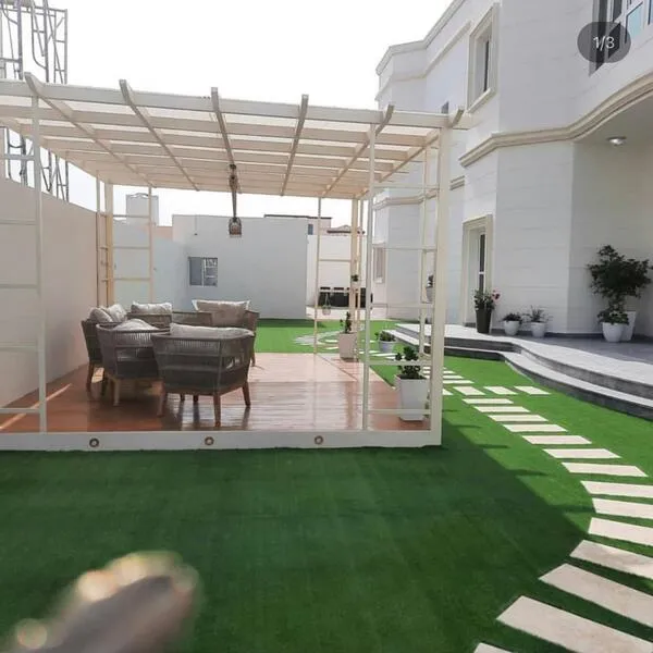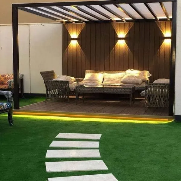 - تصاميم برجولات حديد لحدائق المنازل بشكل مميز مع توفير نجيل صناعي ليكون المكان مثالى.