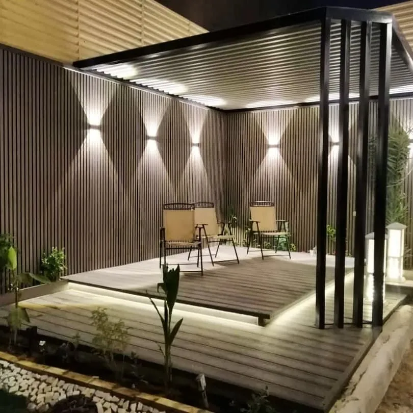 - تصاميم برجولات حديد يتم تأسيس المظلة بعمل بليتات على الأرض مع عمل السقف من الاعلى وعمل حديد قص بالليزر من الجوانب بشكل مميز.